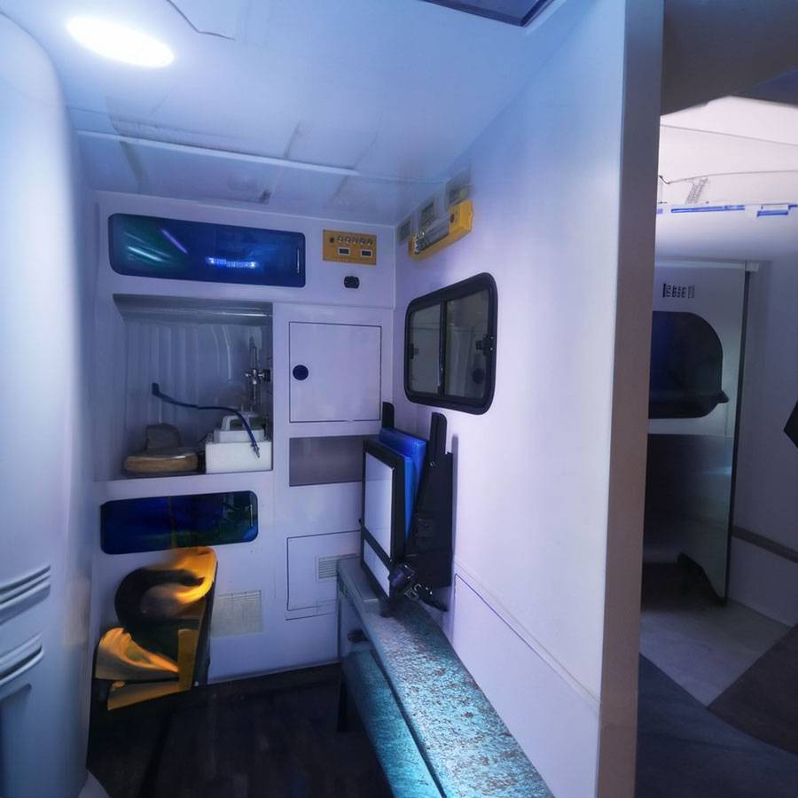 2、10L氧气瓶1个固定装置,2个输液钩,1个消毒灯,1个污物桶等急救设备;
