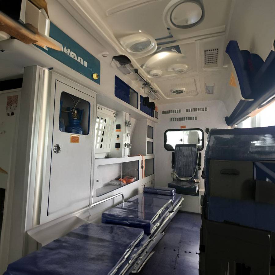 4、车内设备包括:自动上车担架床、自动呼吸机、心电监护仪、吸痰器、呼吸气囊、氧气系统、血压心跳仪、急救设备等。